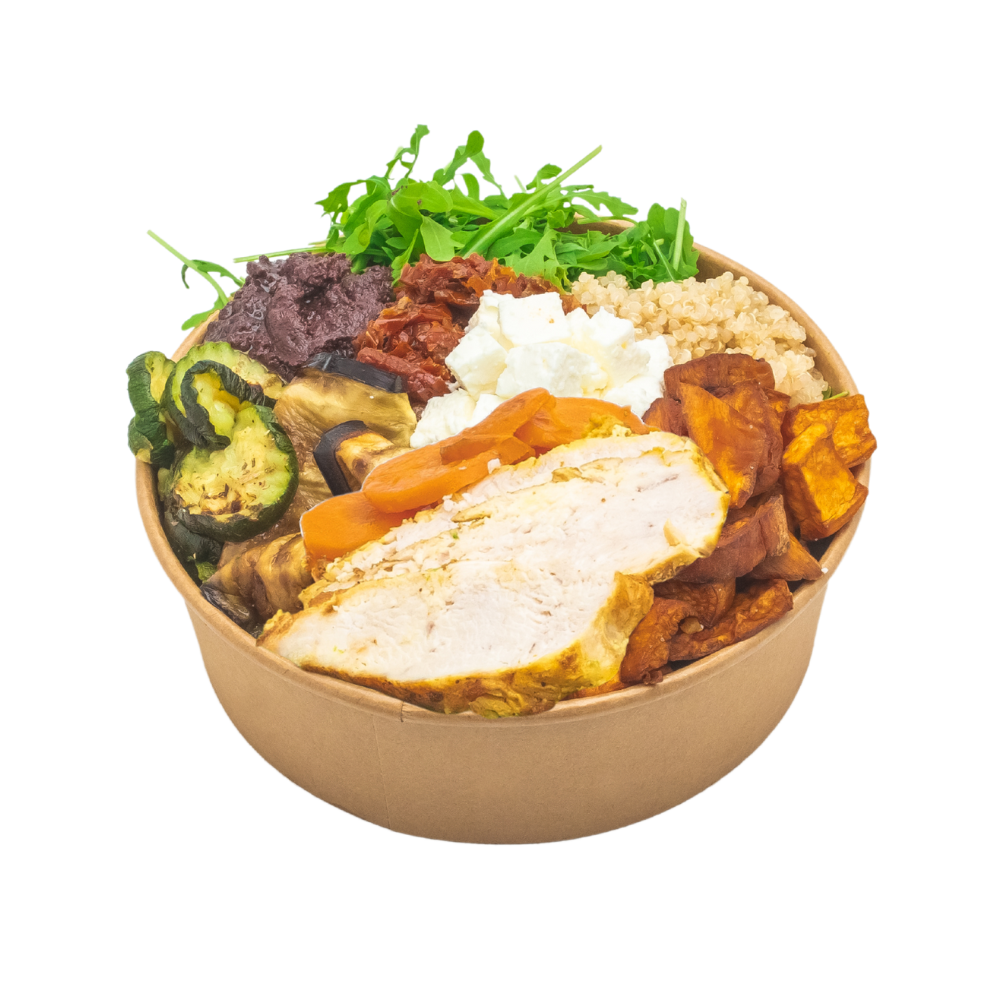 Quinoa, roquette, aubergine, courgette , patate douce, fêta, tomate séchée, tapenade d’olive, huile d’olive ou pesto