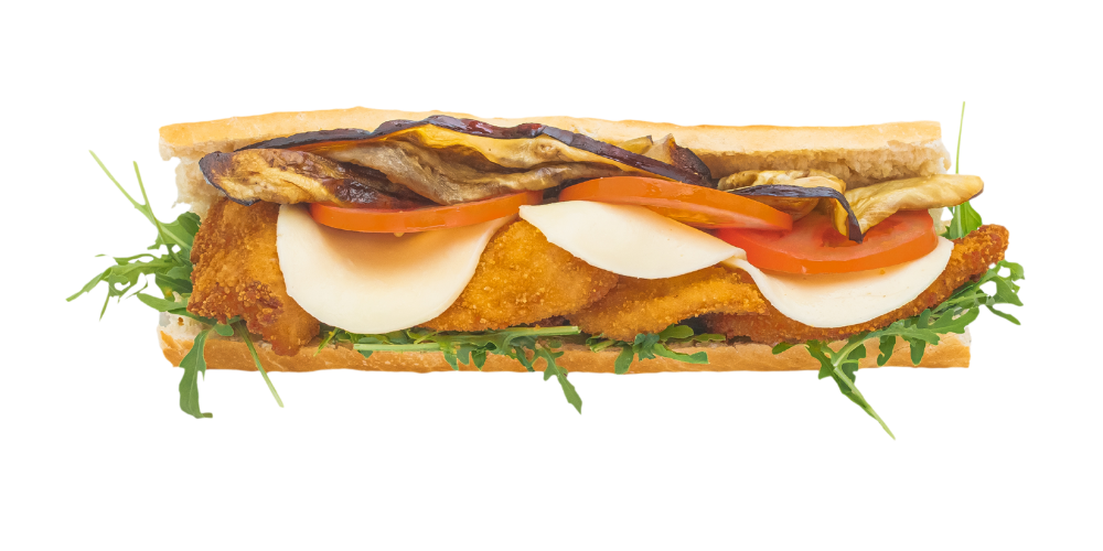 Poulet pané ou rôti, tomate, roquette, mozzarella (3 tranches), aubergine, tartare