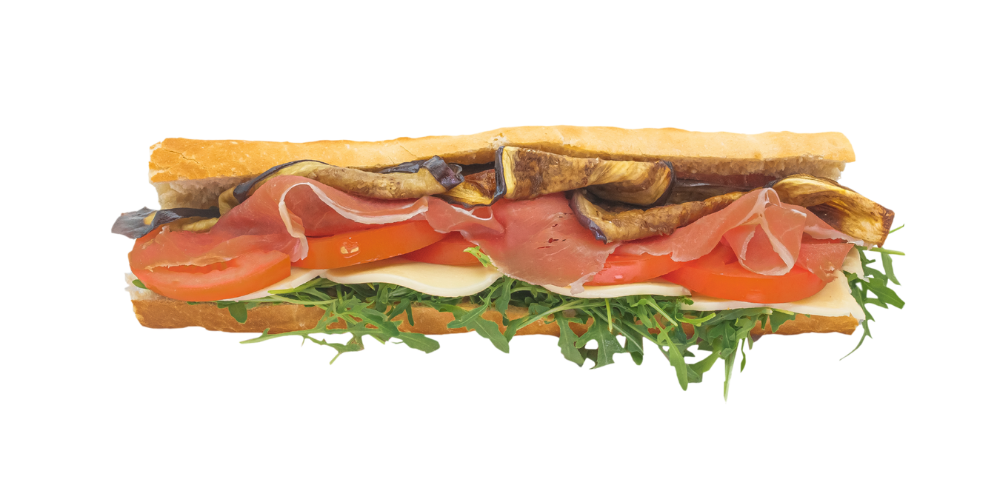 Jambon italien, mozzarella (3 tranches), tomate, roquette, aubergine, pesto.