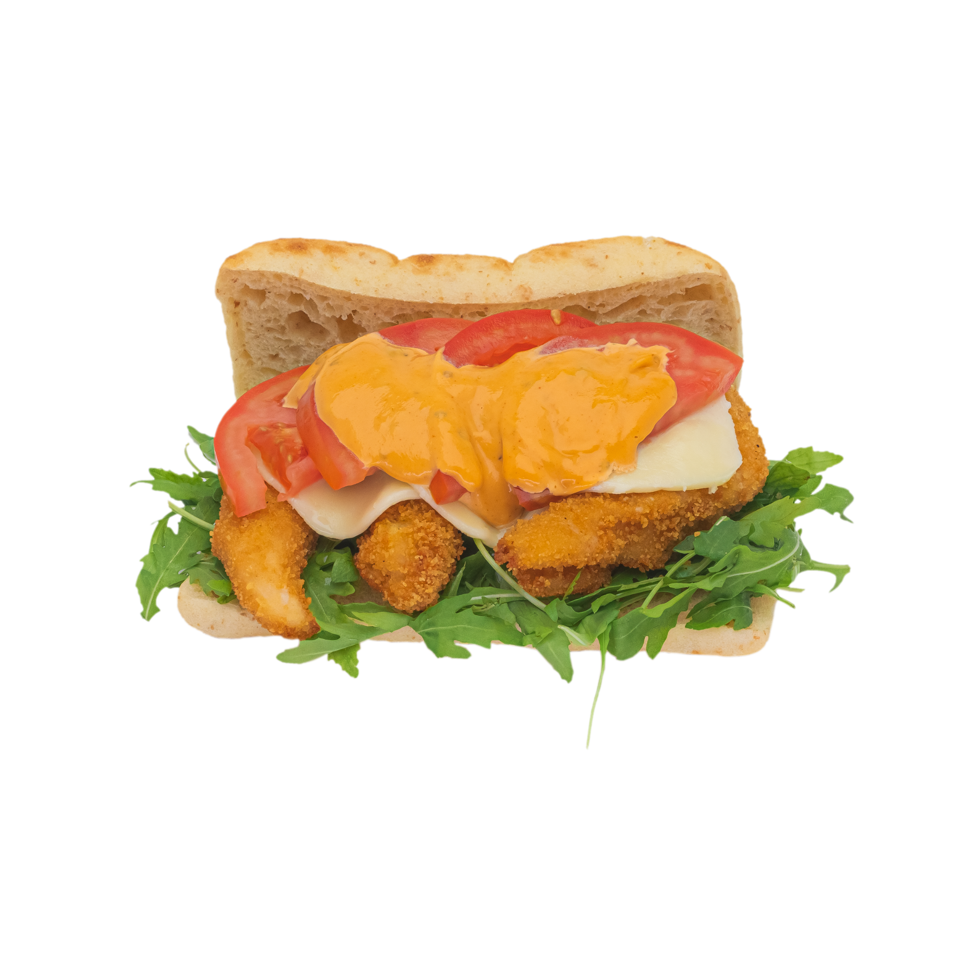 Panini avec poulet rôti, tomate, cheddar, iceberg, lardons, sauce barbecue & cocktail