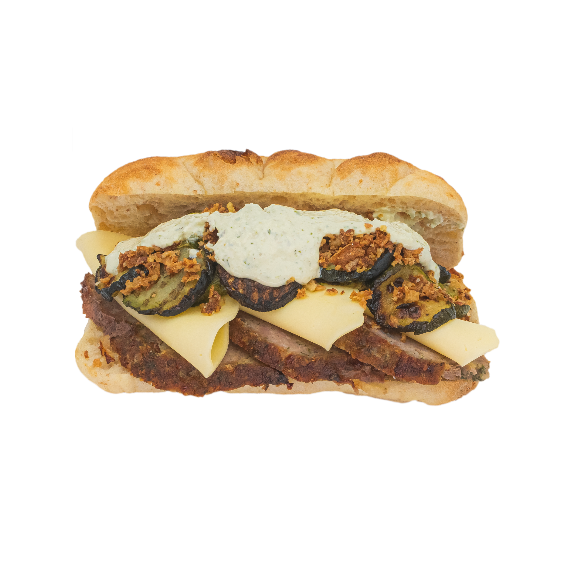 Panini avec pain de viande, gouda, courgette, oignon frit, tartare piquante