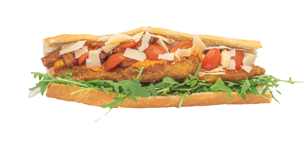 Poisson pané, mayo, tapenade de poivron, patate douce, parmesan, tomate cerise, roquette