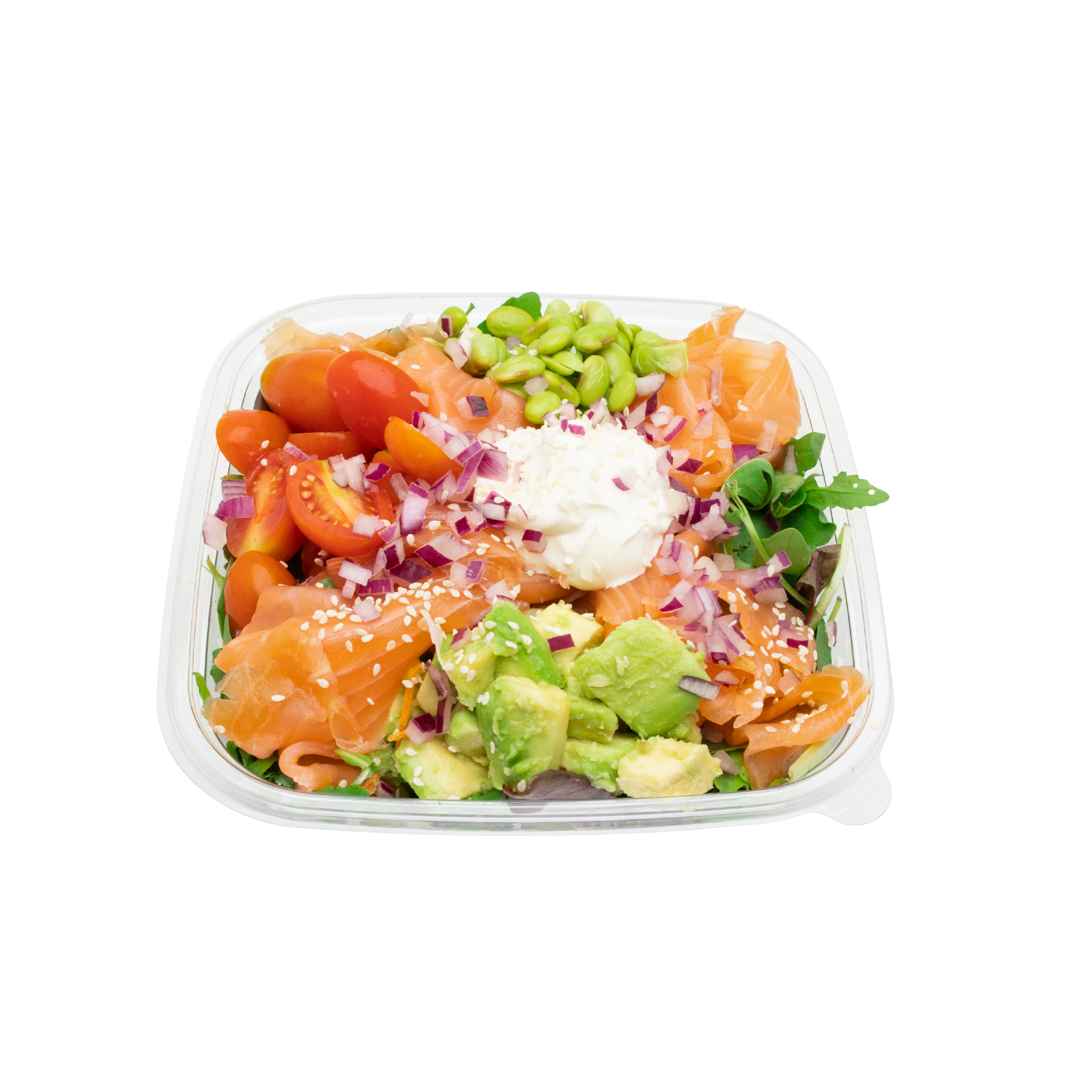Mesclun, saumon fumé, edamame, avocat, tomate cerise, oignon rouge, sésame, cream cheese, vinaigrette miel moutarde