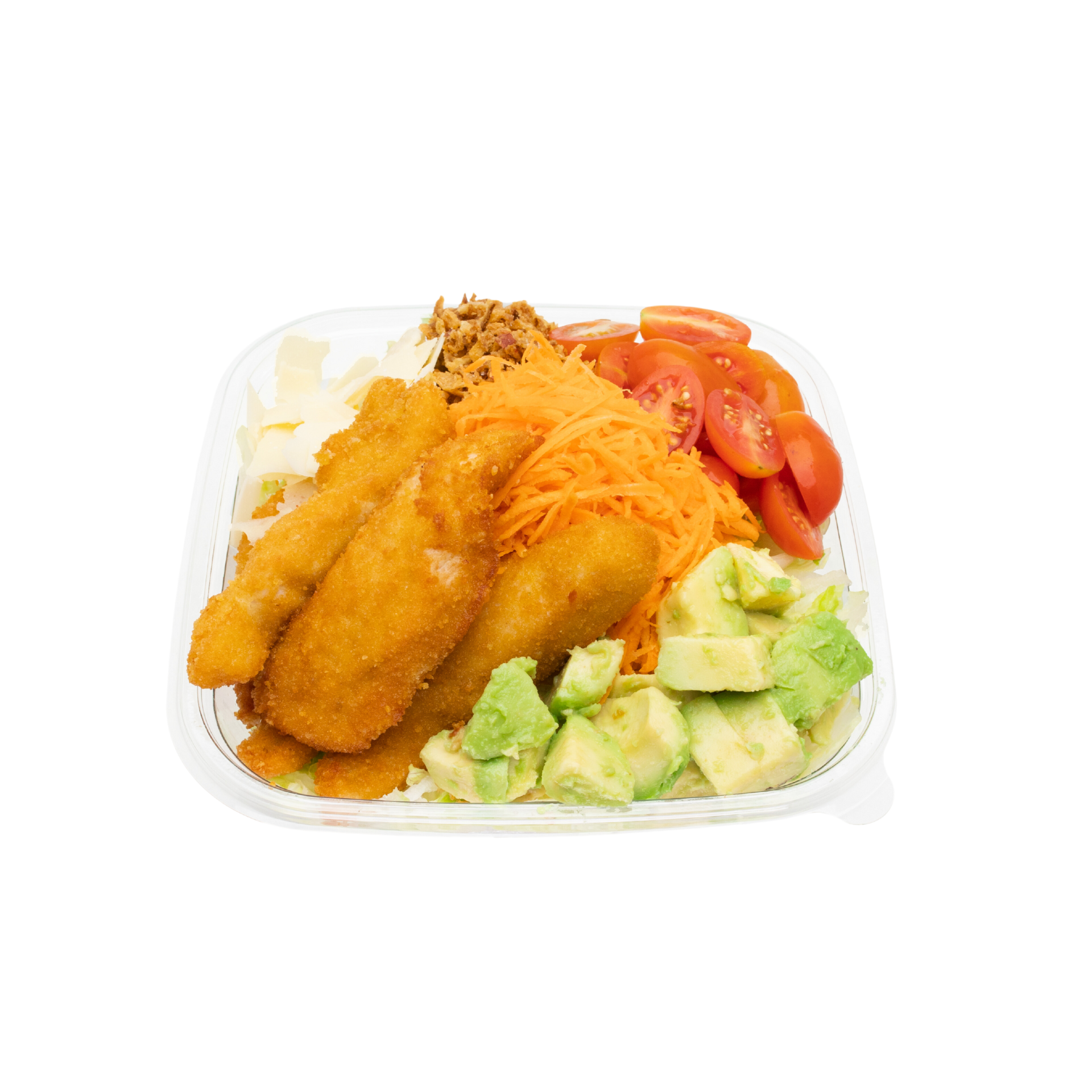 Poulet pané, iceberg, parmesan, tomates cerises, avocats, carottes râpées, oignons frits, vinaigrette